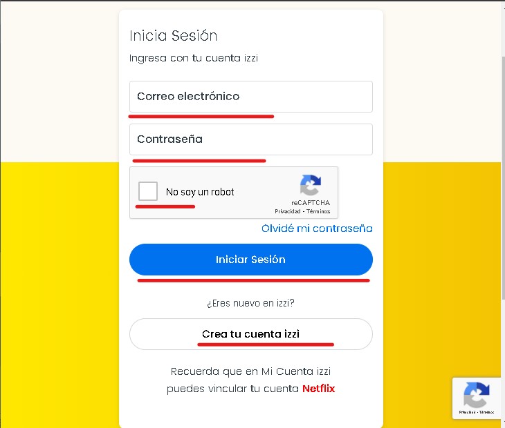 Aquí, introduce tus credenciales de tu cuenta Izzi. Si no tienes una cuenta, puedes crearte una. Luego completa el Captcha e inicia sesión.