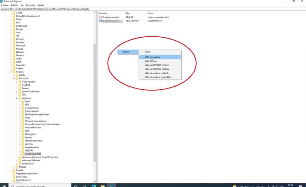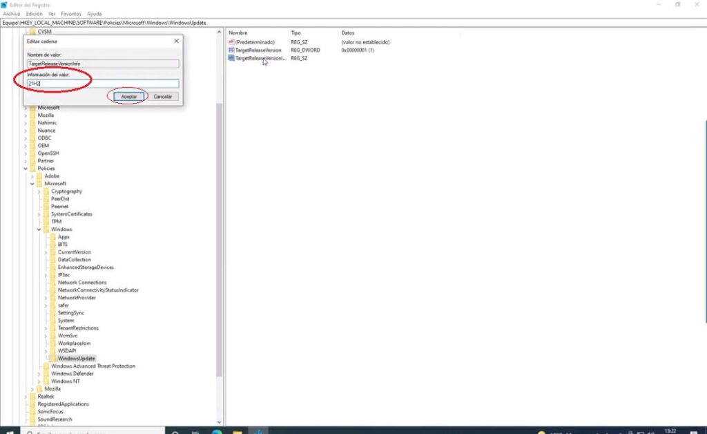 8. Para crear la segunda clave debes colocar el cursor en la ventana central, hacer clic al botón derecho, pulsar > y seleccionar >. Acto seguido debes colocarle el siguiente nombre: TargetReleaseVersionInfo y luego pulsas la tecla Intro para que el nombre quede guardado. Por último, debes hacer doble clic en la clave y colocar en «Información del Valor» la numeración de la última versión de Windows 10, que en este caso sería la siguiente: 21H2. Luego pulsas > para guardar los cambios.