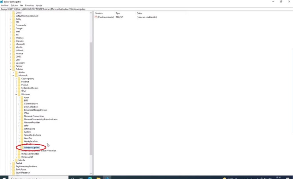 6. A continuación, selecciona la carpeta «WindowsUpdate», y dentro de esa carpeta vas a crear dos claves.