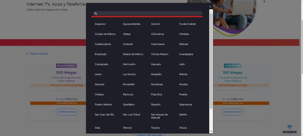 Primero, ingresa al portal oficial de TotalPlay – Página oficial. Dentro de su web, tendrás que ingresar tu ciudad. Esto puedes hacerlo en la parte superior derecha del portal.