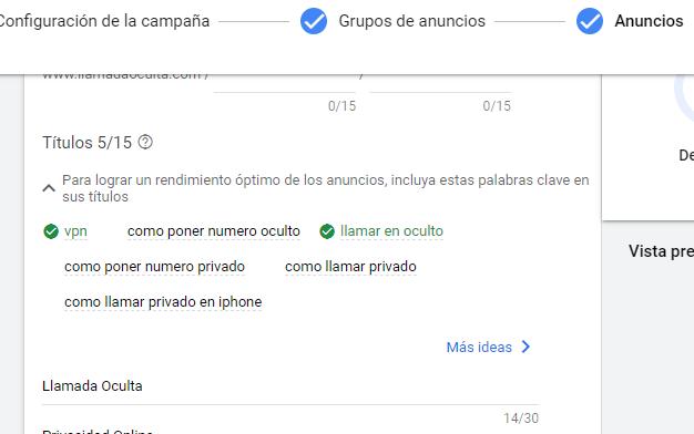 Si creas tu campaña usando el Modo Experto de Google Ads, el paso final para terminar tu campaña será agregar títulos y un montón de palabras clave a tu anuncio.