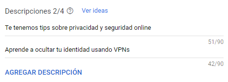 En cada descripción, podrás agregar hasta 90 caracteres. Por lo tanto, podrás colocar palabras clave de cola larga mucho más largas de las que podías agregar en “Títulos”.