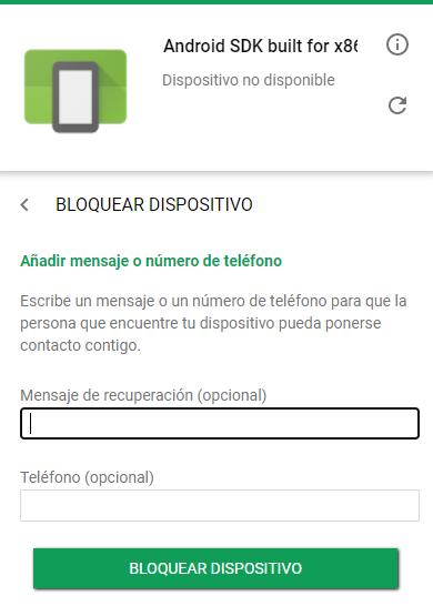 Tienes la opción de mostrar un mensaje en tu móvil cuando generes la contraseña, y también puedes agregar otro número de teléfono que no sea el de tu móvil bloqueado. Sin embargo, en nuestro caso, vamos a saltarnos este paso, y vamos a clicar en “Bloquear dispositivo”.