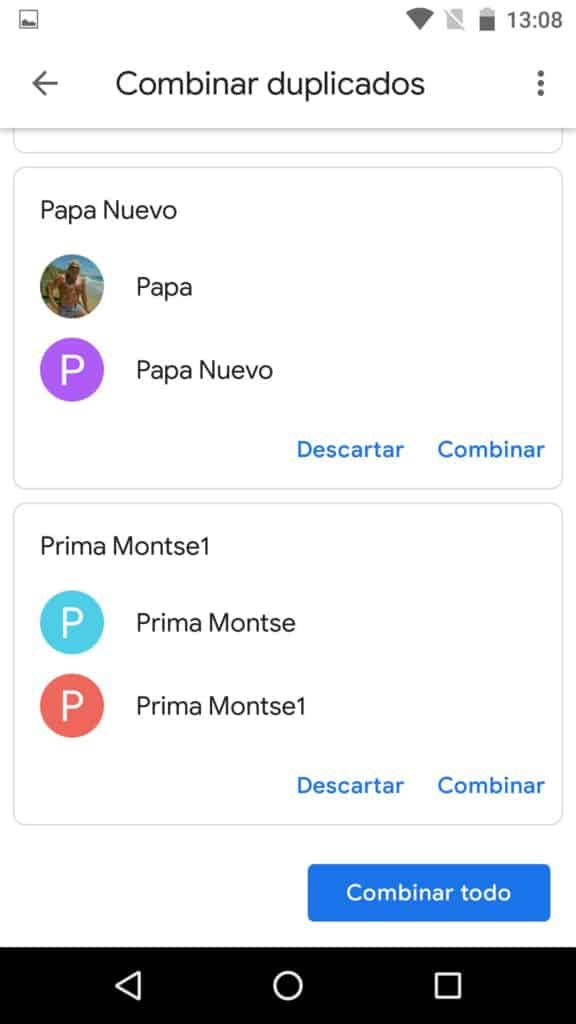 Si quieres iniciar el proceso manualmente, tan sólo habría que abrir la aplicación contactos en tu smartphone y en el botón de menú (icono superior izquierdo, la «hamburguesita») buscar la opción de combinar contactos duplicados. Si no te aparece, es que no hay ningún contacto duplicado.