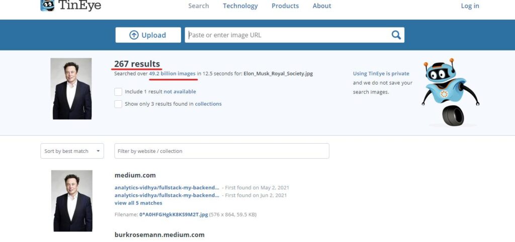Pues bien, en mi ordenador tengo una imagen de Elon Musk y la pondré en TinEye para ver qué resultados puedo obtener. (Obviamente que al ser una figura pública obtendré una exageración de resultados)
