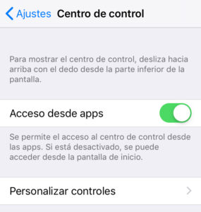 Opción “Centro de control” del menú de la app de Ajustes de un iPhone.