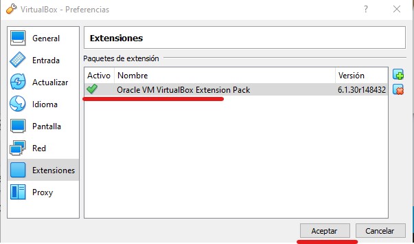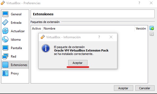 Cuando se ejecute Virtualbox solo te quedará instalar el Extensión Pack, el segundo archivo que has descargado anteriormente.