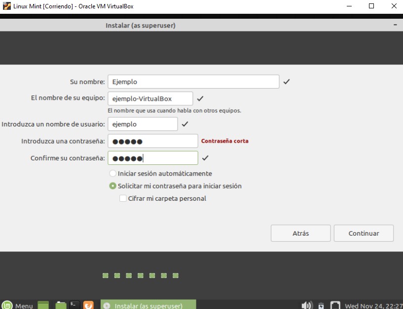 - Paso 5: Escoger los datos personales de la Maquina virtual e Instalar Linux Mint.