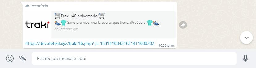 En la siguiente imagen podemos apreciar un claro ejemplo de un link malicioso en donde te prometen “probar tu suerte para ganar premios” en una tienda de ropa llamada Traki.