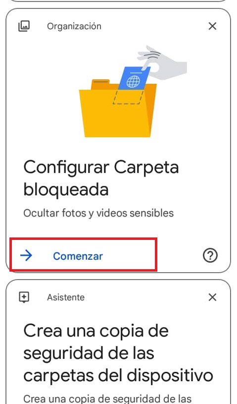- Posteriormente, desliza hasta encontrar el apartado “configurar carpeta bloqueada” y pulsa en “comenzar”.