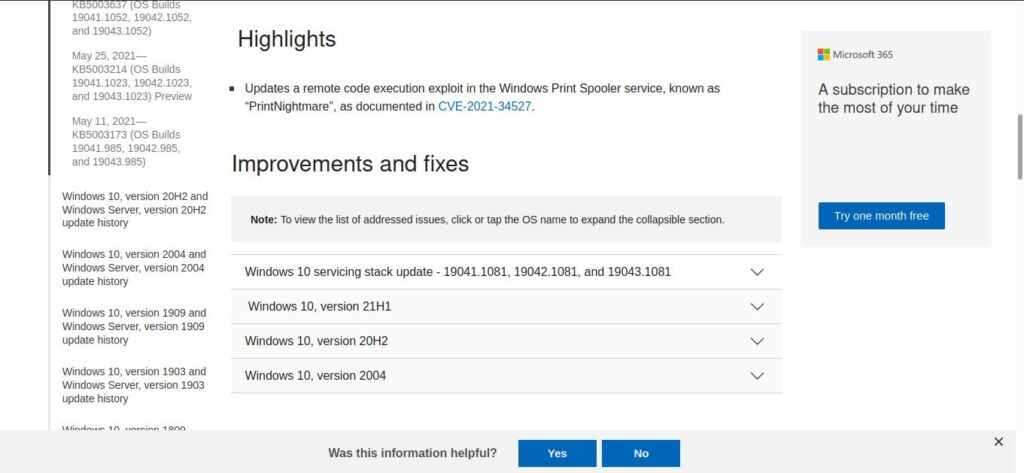 En el caso que no puedas conseguir el parche de actualización para PrintNightmare desde Windows Update no te preocupes. Aquí te dejo la página oficial donde figuran todos los parches KB5004945 para todas las versiones de Windows que aplica.