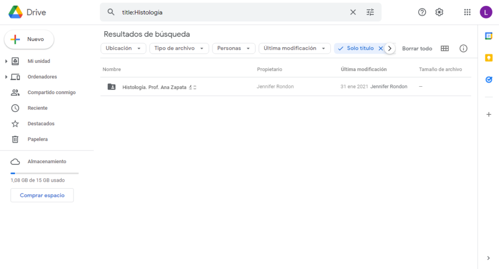 Por ejemplo, nosotros hemos usado nuevamente la palabra “histología”, así que Google Drive nos muestra el único archivo de nuestra unidad que contiene esa palabra en el título.