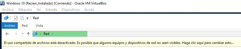 Para activar esta opción y así tener acceso a tus carpetas compartidas, espera a que te salga un mensaje en la parte superior de la carpeta “Red” que diga “El uso compartido de archivos está desactivado”. Clica en ese mensaje.