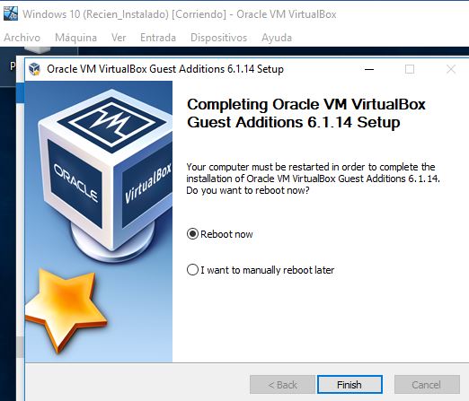 Te saldrá un mensaje diciéndote de que debes resetear el ordenador para terminar de instalar las Guest Additions. Clica en «Reboot now» o «reiniciar ahora», y luego en «finish».