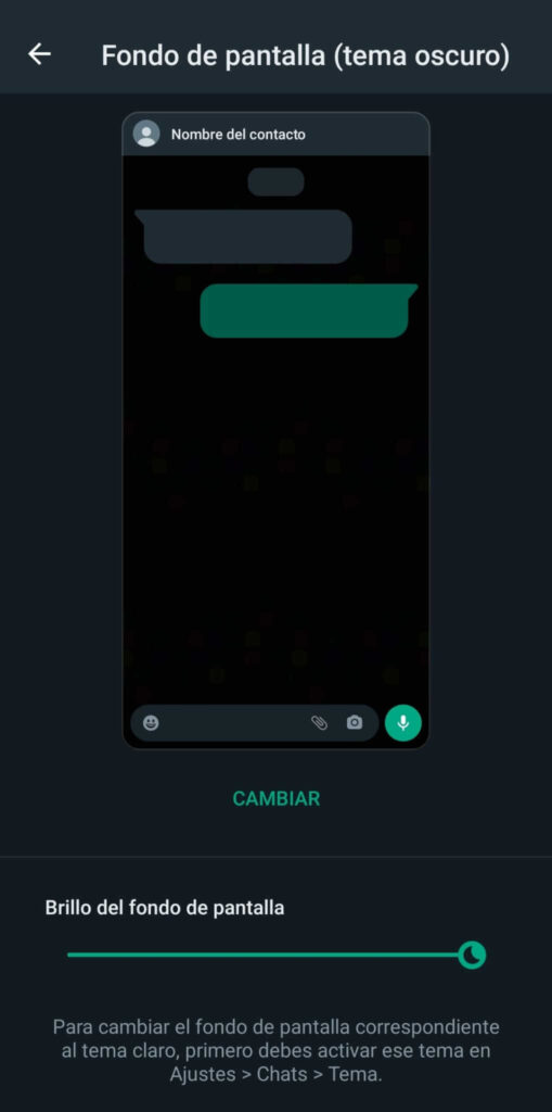 Además puedes escoger que el fondo de pantalla no contenga las figuras que trae por defecto WhatsApp, así te quedaría más oscuro aún.