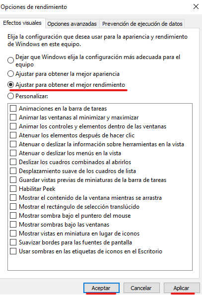 Notarás que desactivarán todos los efectos visuales de Windows. Por lo tanto haz clic en “Aplicar” y luego en “Aceptar”.