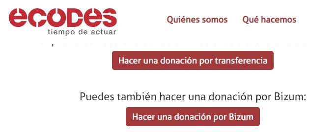 Por ejemplo, este es el sitio web de la ONG ECODES : https://ecodes.org/haz-una-donacion . En esta página del sitio, podrás ver una opción que te permite hacer donaciones por Bizum. Clica ahí, y podrás obtener el teléfono de esa ONG para hacerles el pago por Bizum.