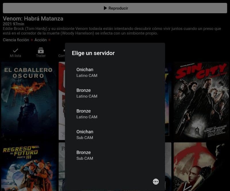 Ventana de vista previa de una película en PlayHub Plus mostrando el modal para seleccionar un servidor.