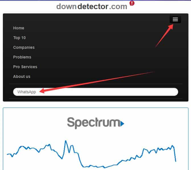 Para verificar el estado de WhatsApp desde Downdetector, solo debes acceder al sitio en si desde tu navegador favorito. Cuando ingreses deberás localizar el buscador el cual se encuentra en el menú de las tres líneas en la parte superior derecha del sitio (en su versión móvil) y escribir “WhatsApp” tal cual se muestra en la siguiente imagen.